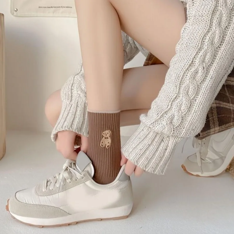 5 Pairs of Mixed Color Teddy Bear Mid Tube Socks with Cute Cartoon Pattern Design, Suitable for Casual Wear in All Seasons